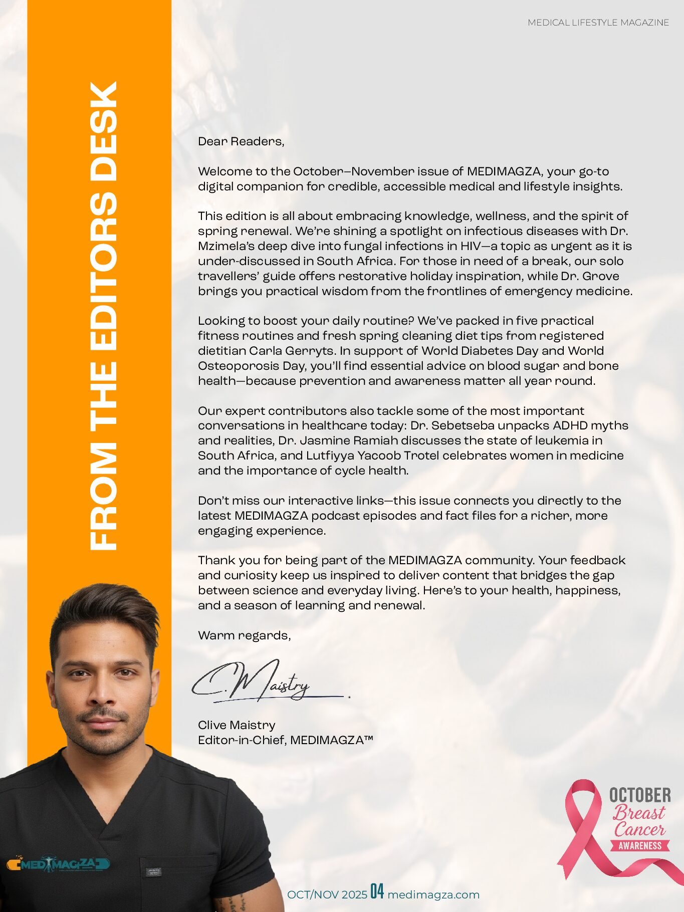 Welcome to the October–November 2025 edition of MEDIMAGZA, South Africa’s premium digital medical lifestyle magazine. This issue is your trusted source for accessible, expert-driven health and wellness insights. Whether you are a healthcare professional or a health-conscious reader, you will find valuable content made just for you.